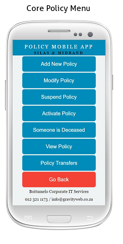 By using CORE you will be able to manage your policies, run debit orders, accept payments at Easypay, Boxer, Shoprite, Pep, Woolworths, Checkers, Pick n Pay and other tills at retail shops. You can arrange funerals, manage your fleet and track cars, automatically send notification when children turn 21 or when premiums are missed. Our HR module helps you manage employees and email payslips while the Finance module lets you do invoicing and quotations, sales and even Lay-Bye for tombstones.